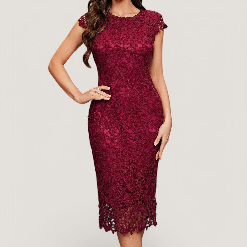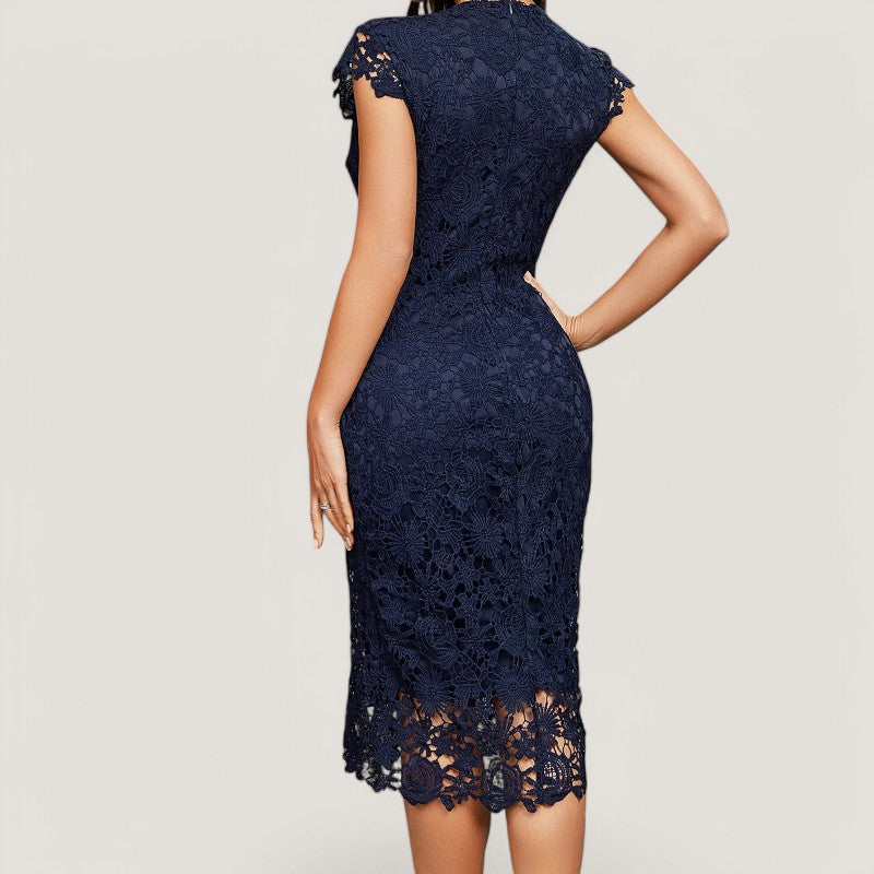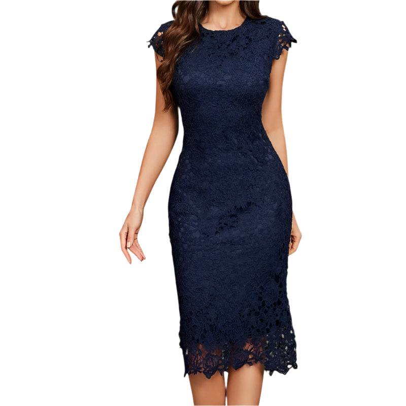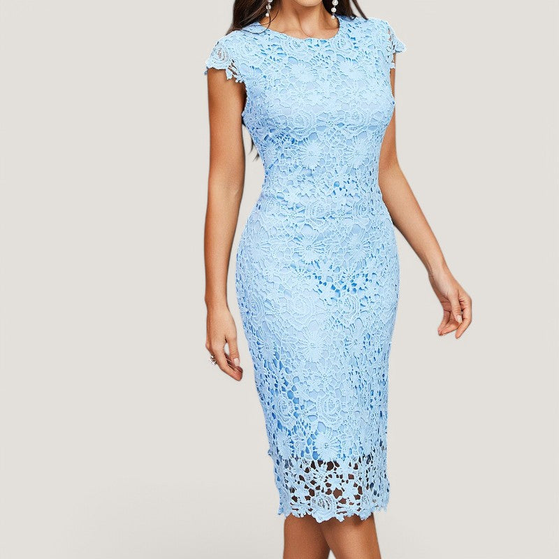 Designet med en moderne silhuett, denne kjolen er ideell for enhver anledning, fra bryllup til sommerfester. Den delikate blonden og den flatterende passformen gir et tidløst utseende som passer til enhver stil.