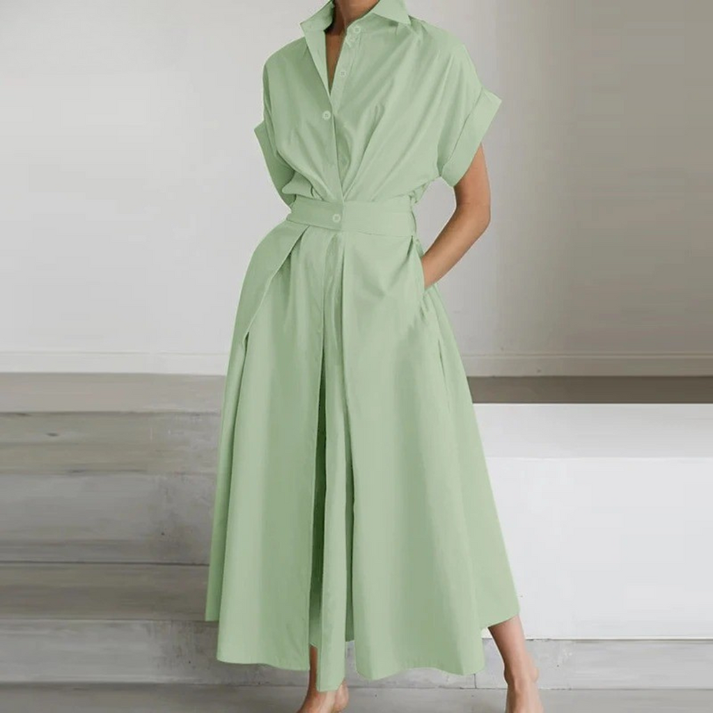 Denne midi-skjortekjolen for kvinner har en revershals, korte ermer og en høy midje som skaper en flatterende, elegant silhuett. Den er designet med en strukturert, men likevel flytende form, og kombinerer en moderne stil med tidløs eleganse.