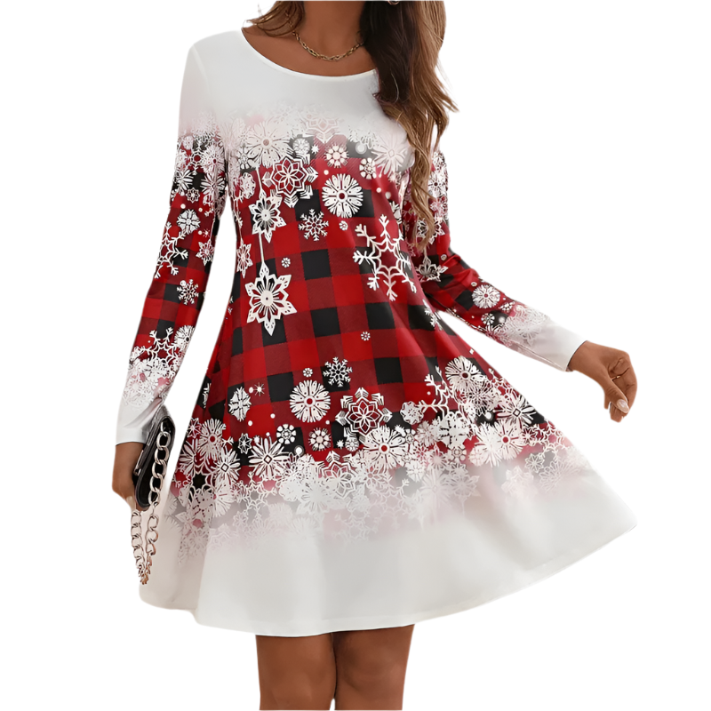Den rødrutete kjolen med snøfnuggmønster fanger den magiske atmosfæren av høytiden, og gir deg en følelse av glede og varme. Den flatterende passformen passer til alle kroppstyper, og gjør at du føler deg både komfortabel og stilig.