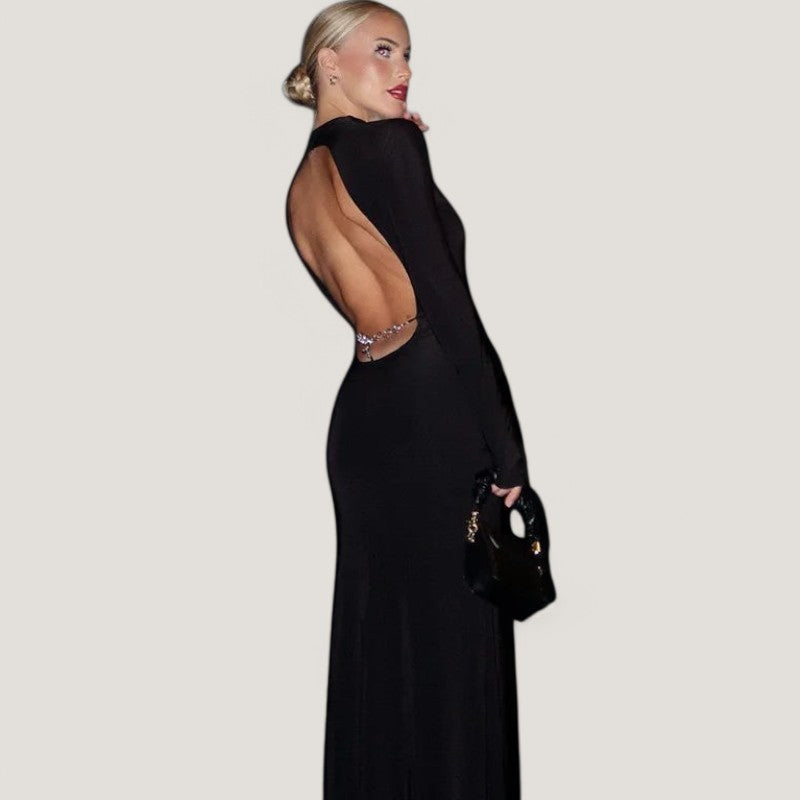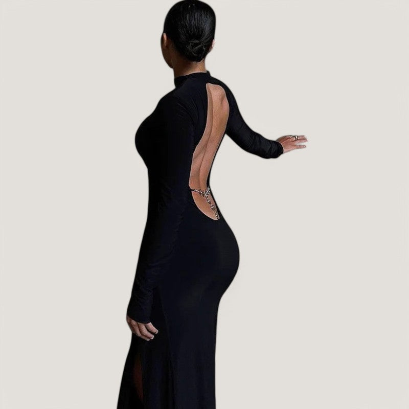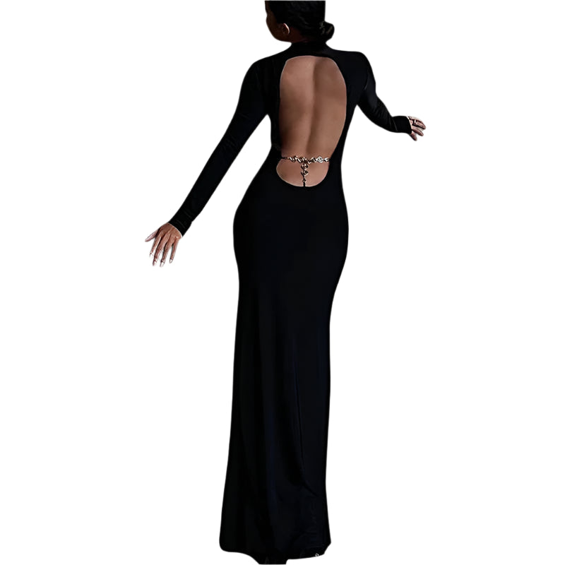 Med sitt dristige design og en kjededetalj som elegant draperer ryggen, er denne kjolen et blikkfang. Den glatte, svarte stoffet gir en luksuriøs følelse, noe som gjør den ideell for formelle sammenkomster og kvelder ute.