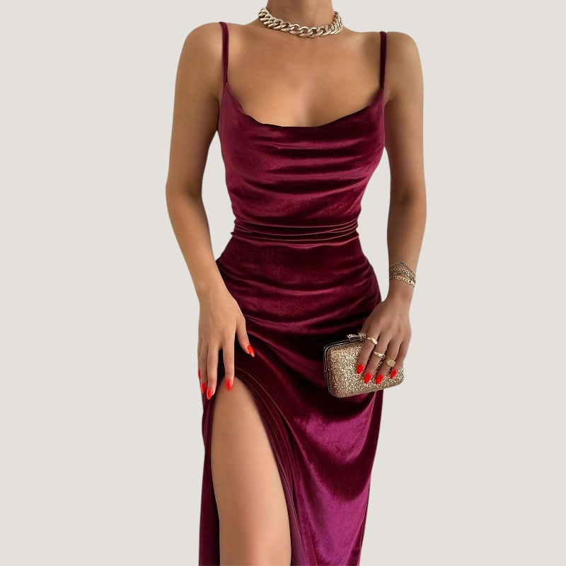 Kjolen har en moderne design med en flatterende fente som gir et sofistikert preg. Den kroppsnære silhuetten gir en elegant look, mens de delikate fronces tilfører en feminin touch. Denne kjolen er et perfekt valg for enhver festlig anledning.