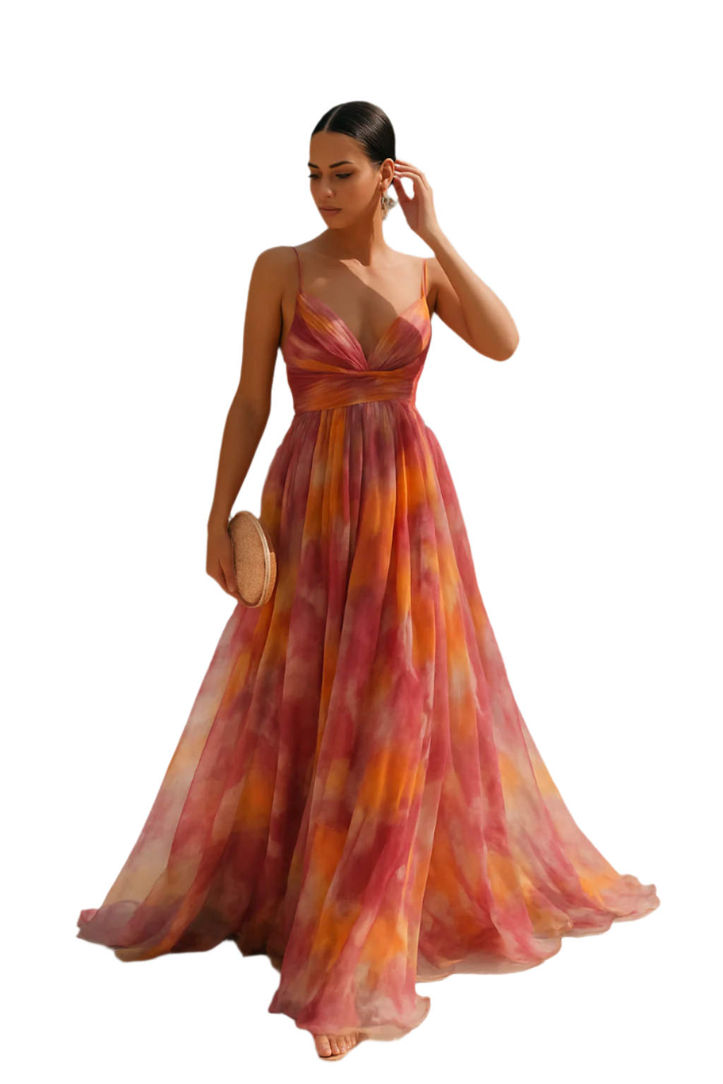 Kjole for kvinner med blomsterdesign og flytende silhuett