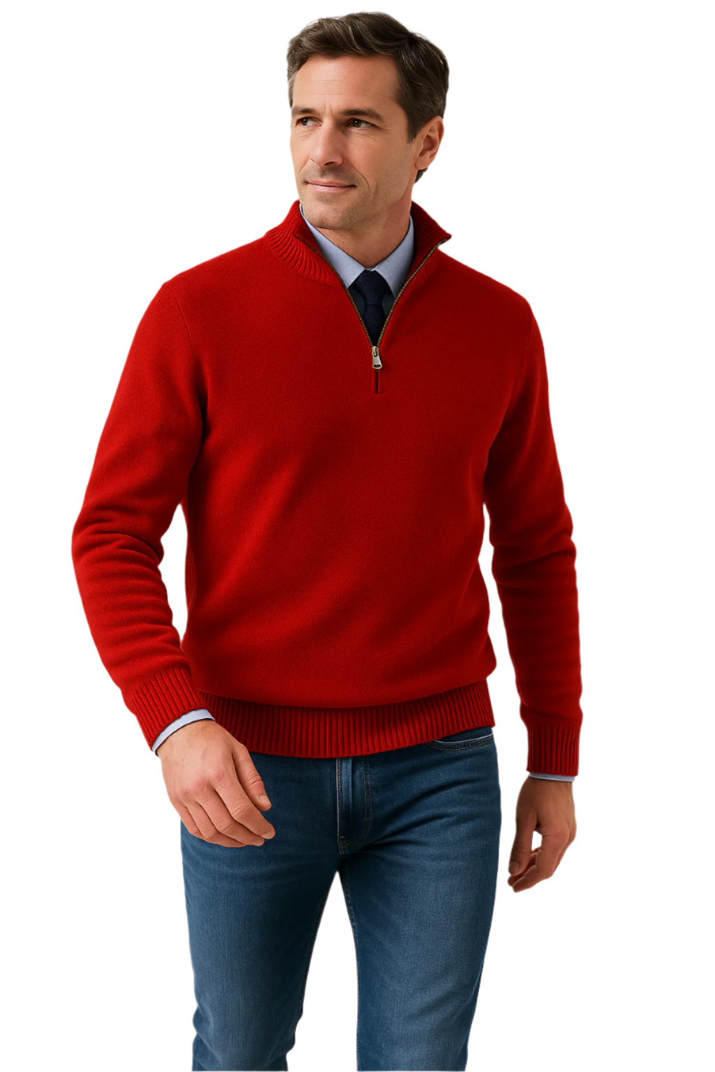 Den høye kragen med halv rits tilfører struktur og allsidighet til silhuetten, mens ribbede detaljer gir en pen finish. Denne trøyen er perfekt for både hverdagsbruk og mer formelle anledninger.