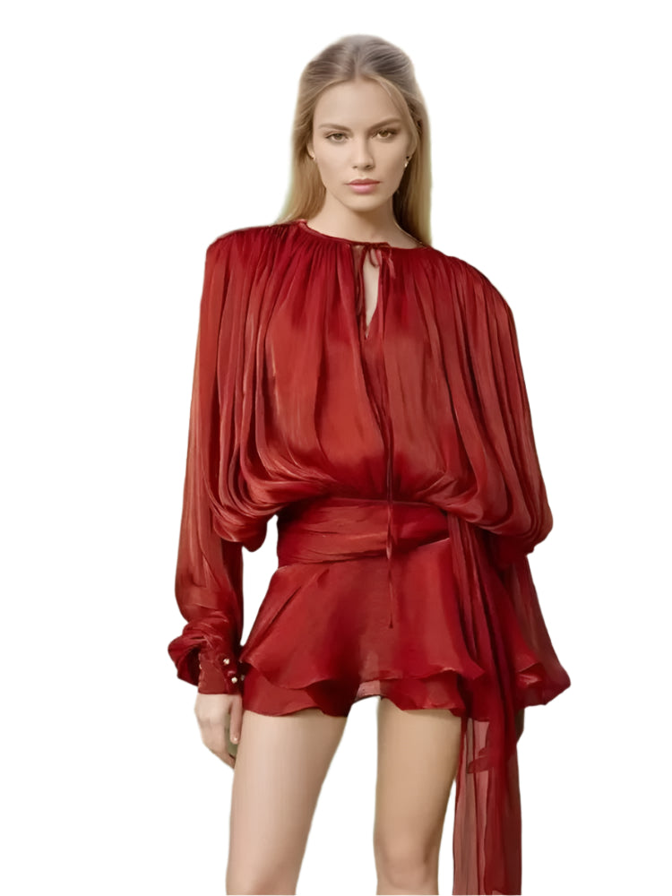 Denne blusekjolen har elegante volanger, lanternemuffer og snøring foran som gir struktur og sjarm. Den runde halsen gir et rent uttrykk, mens den rynkede midjen og de flagrende ermene gir bevegelse og en flatterende passform.