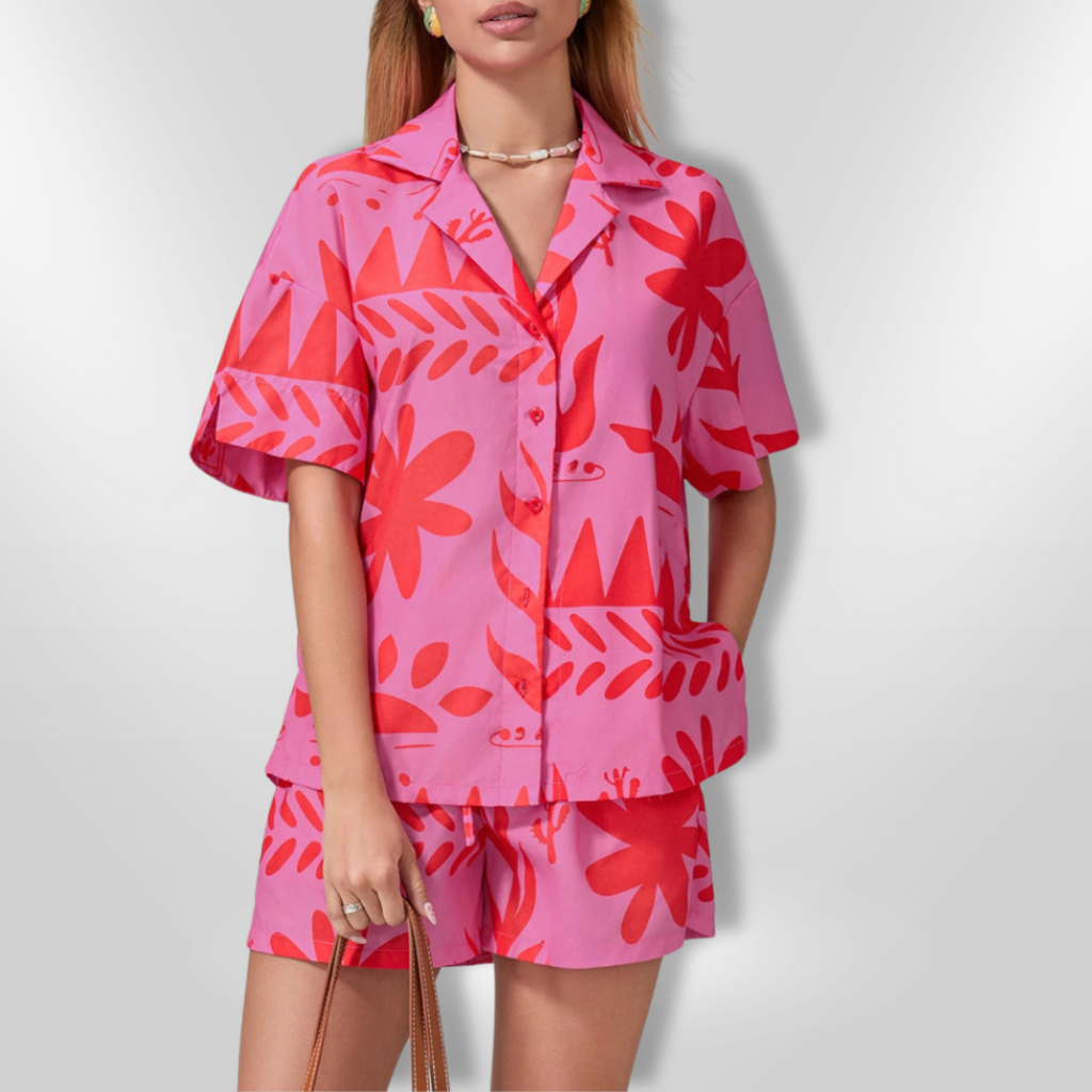 Dette settet har et dristig tropisk mønster som lyser opp ethvert rom. Den lette og pustende kvaliteten gjør det ideelt for både hjemmebruk og uformelle utflukter, og den avslappede passformen gir en moderne og chic silhuett.
