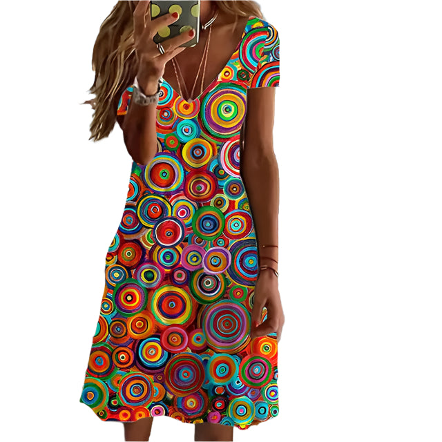 Med sitt lekne design og behagelige passform, er denne kjolen ideell for både hverdagsbruk og spesielle anledninger. Den kombinerer fargerike mønstre med en silhuett som fremhever din naturlige skjønnhet.