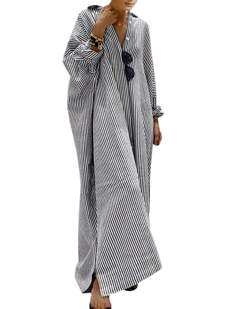 Maxikjolen er designet med et moderne preg, og den myke bomullsmiksen gir en behagelig opplevelse hele dagen. Den har en klassisk omlegekrage og en knappelukking foran, noe som gir et raffinert utseende. Den stilige stripete designen gjør at denne kjolen kan brukes til mange anledninger.