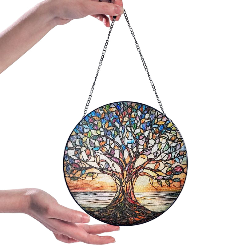 Dette håndlagde glassmaleriet er ikke bare en dekorasjon, men også et symbol på vekst og tilknytning. Det passer perfekt i vinduer, drivhus eller som en åndelig dekorasjon i meditasjonsrom.