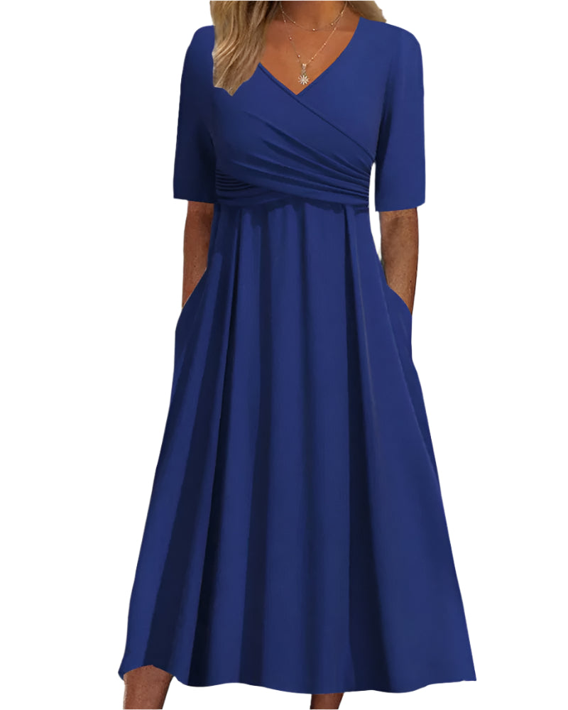 Med sitt unike crossover-design og midilengde silhuett, er denne kjolen ideell for både formelle anledninger og mer uformelle utflukter. Den lette og flytende stoffkvaliteten gir deg frihet til å bevege deg, samtidig som den fremhever din naturlige form.