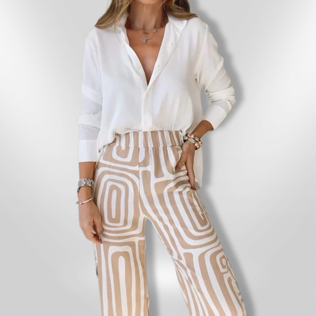Ensemblet består av en klassisk hvit skjorte og et bredt bukse med geometrisk mønster, som sammen skaper en moderne og sofistikert look. Den avslappede passformen og de nøytrale tonene gjør det enkelt å style for både uformelle og semi-formelle anledninger.