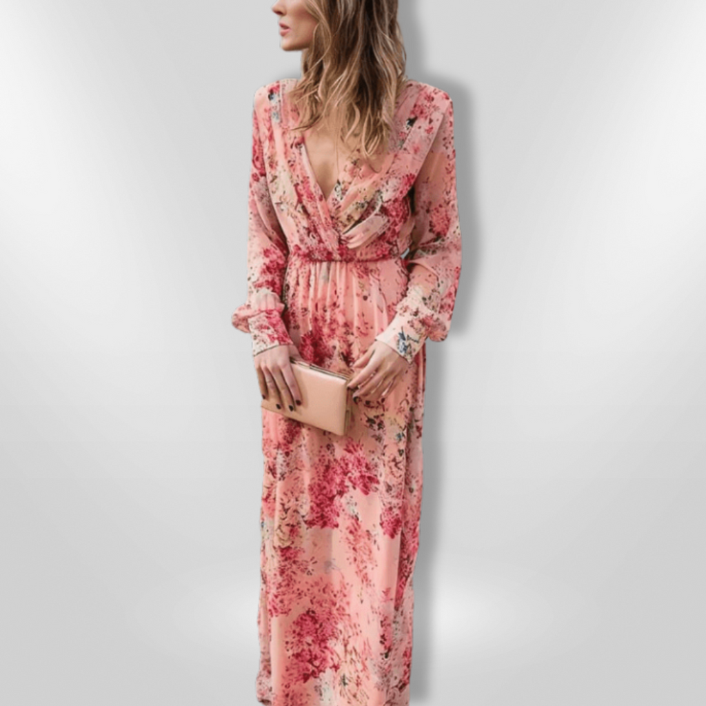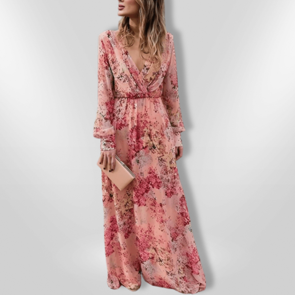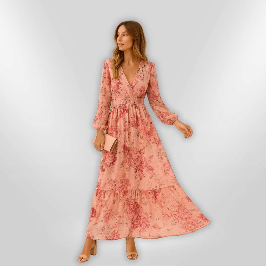 Kjolen har et dypt V-halsutskjæring og en flatterende empire midje, noe som gjør den perfekt for både uformelle utflukter og spesielle anledninger. Den lange, flytende skjæringen gir en grasiøs bevegelse, og de volangede ermene tilfører et lekent preg.