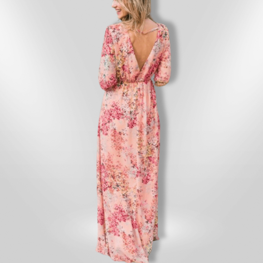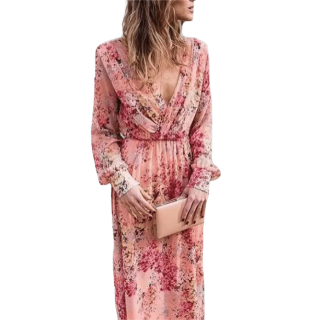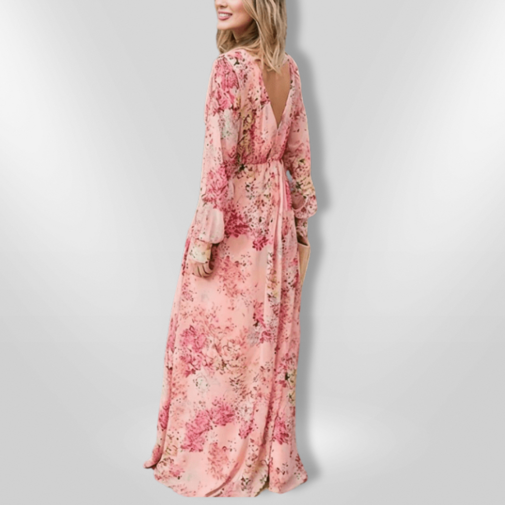 Kjolen har et dypt V-halsutskjæring og en flatterende empire midje, noe som gjør den perfekt for både uformelle utflukter og spesielle anledninger. Den lange, flytende skjæringen gir en grasiøs bevegelse, og de volangede ermene tilfører et lekent preg.