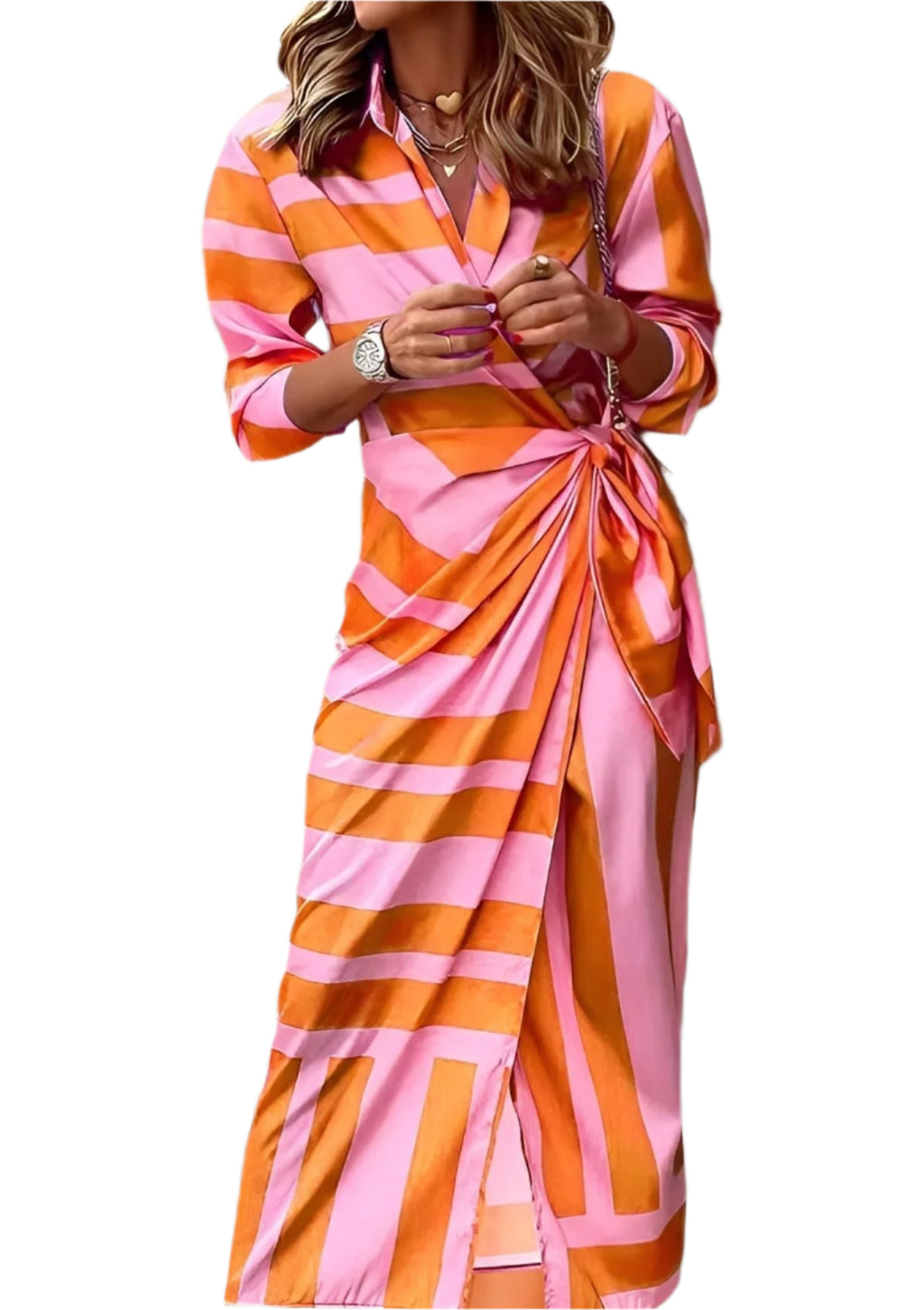 Den fargerike mønstringen tilfører et livlig preg, noe som gjør denne kjolen ideell for både hverdagsbruk og spesielle anledninger. Kombiner den med dine favorittsandaler eller hæler for et stilig utseende som aldri går av moten.