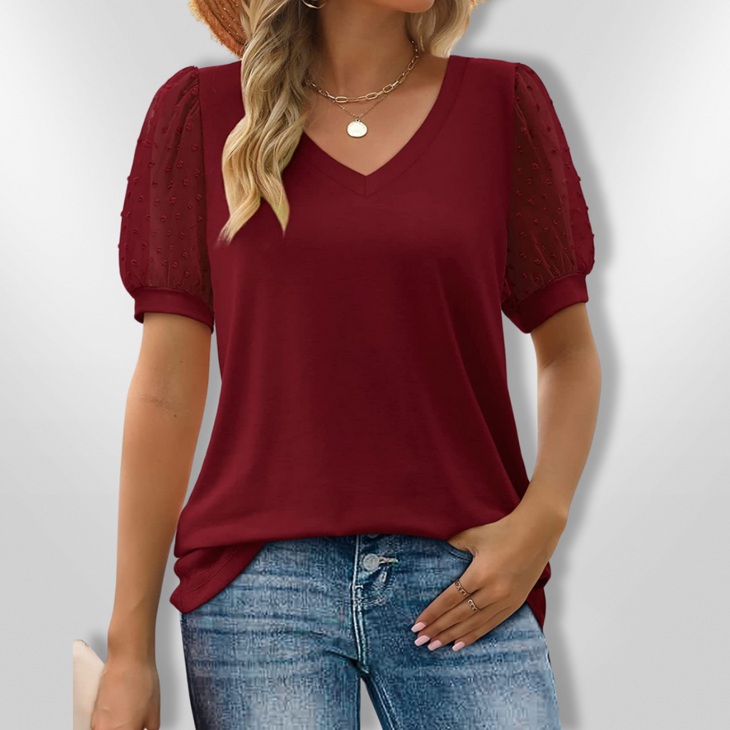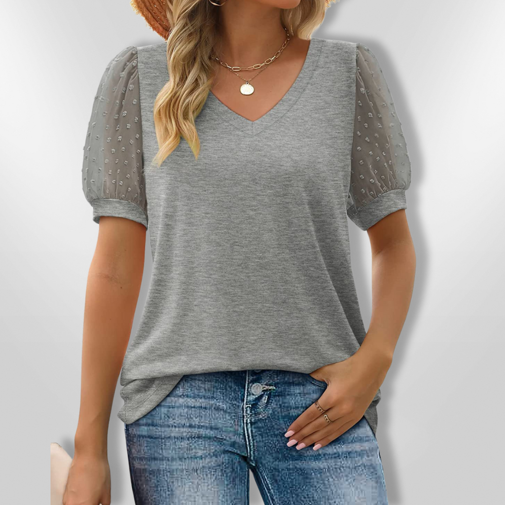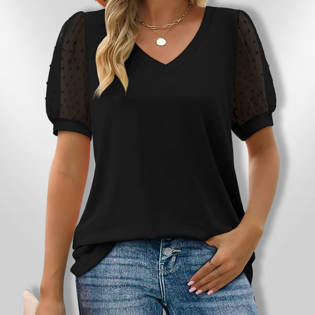 Topp MIA kombinerer stil og komfort på en perfekt måte. Den klassiske V-halsen og de delikate puffermansjettene gir et elegant preg til enhver anledning.