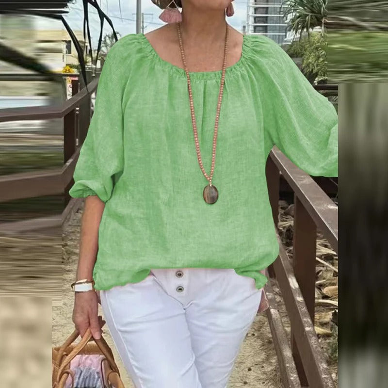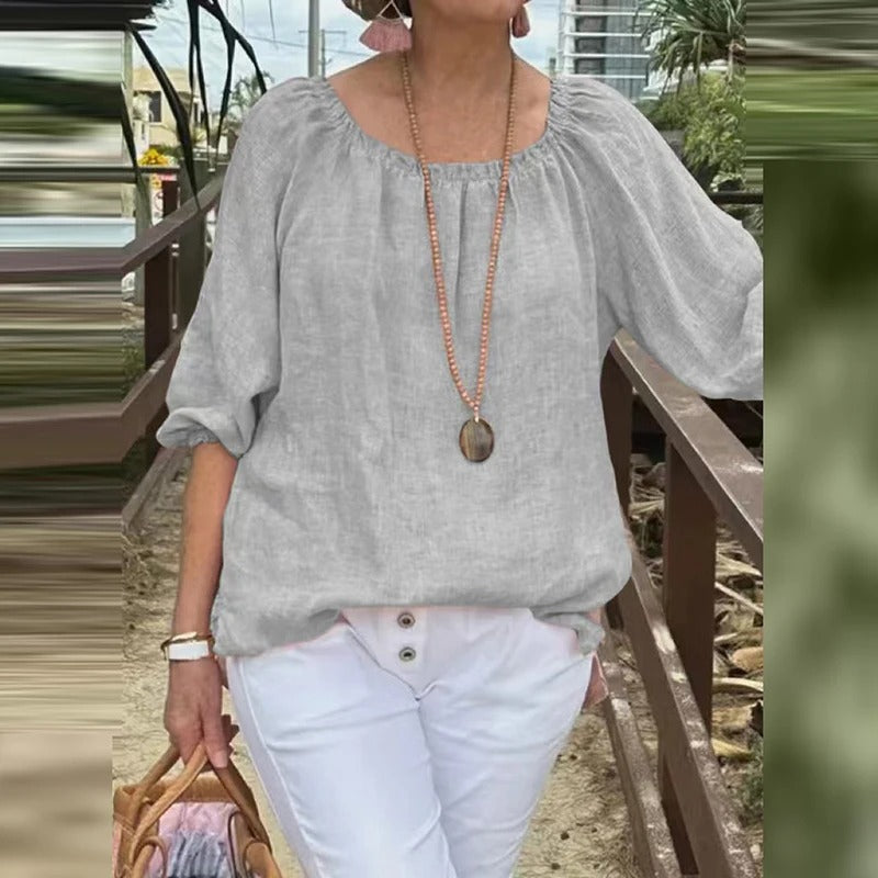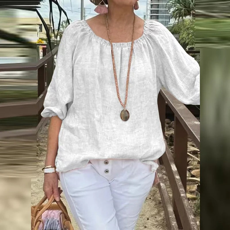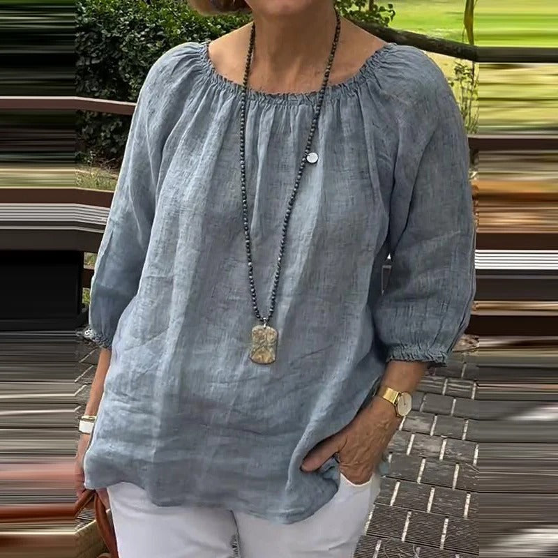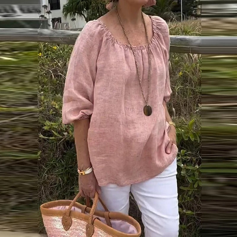 Denne ensfargede blusen er laget av pustende stoff av høy kvalitet og passer perfekt sammen med jeans, bukser eller skjørt for en polert, men avslappet stil. Enten du skal på brunsj eller løpe ærender, er denne blusen et godt valg for diskret raffinement.