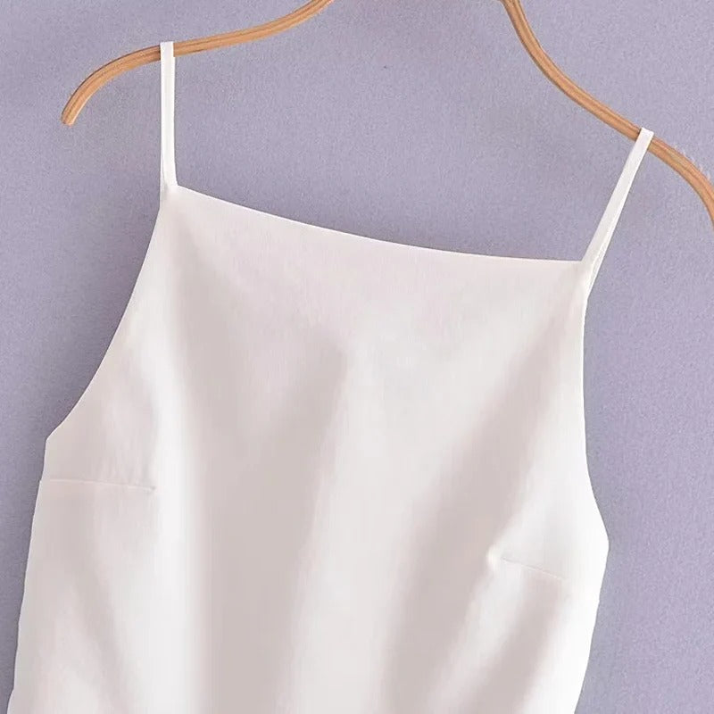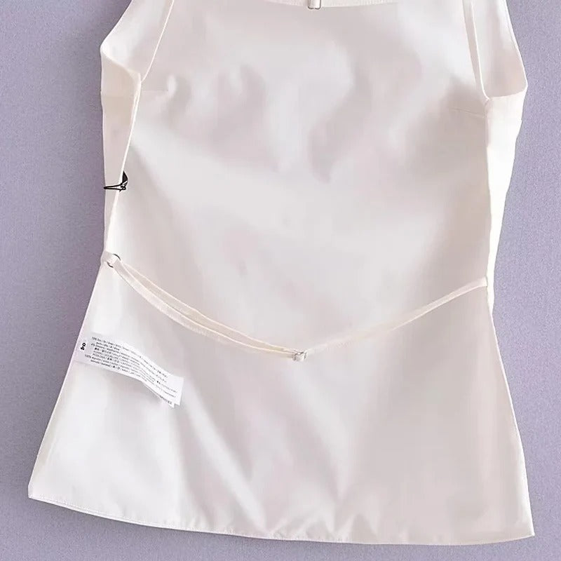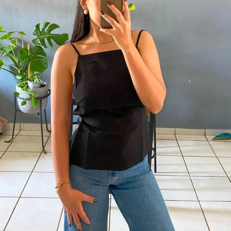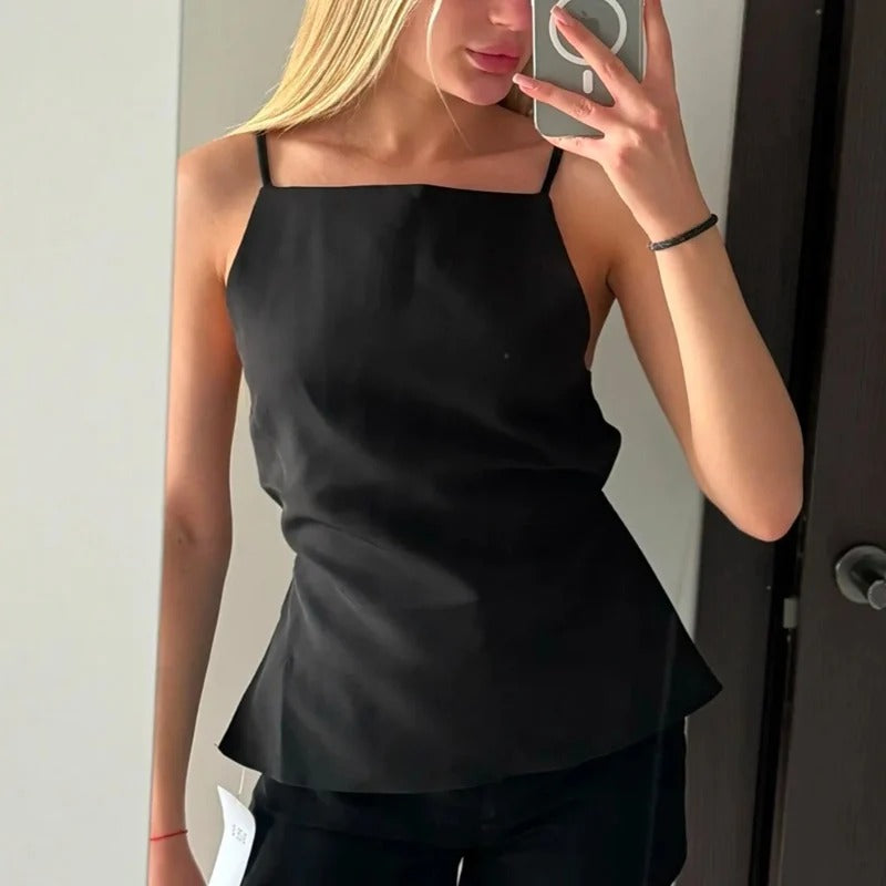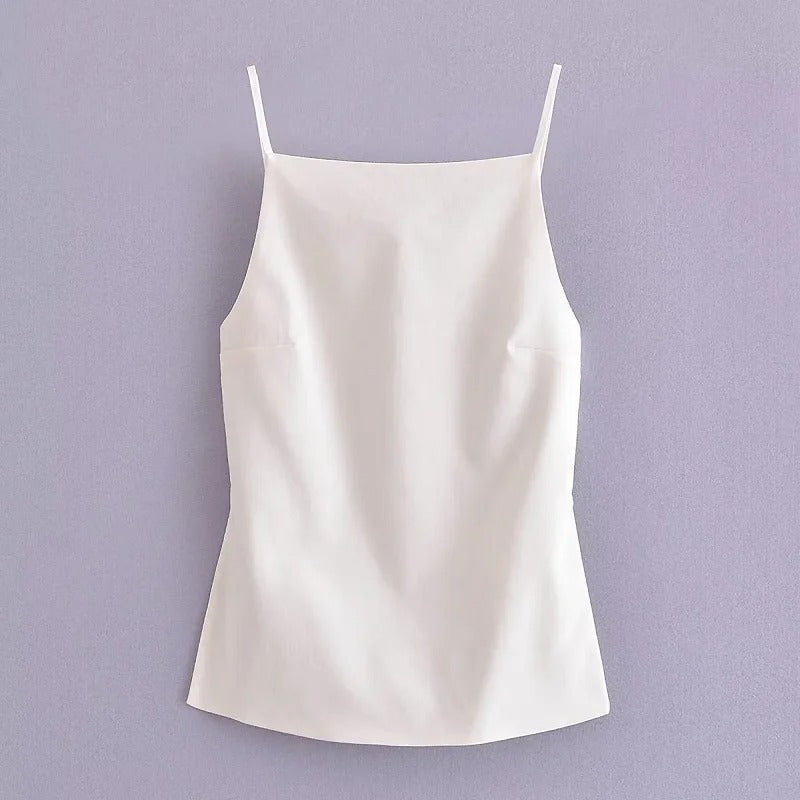 Denne uformelle toppen har en firkantet utringning og åpen rygg for en ren, moderne silhuett. Den er laget av mykt, pustende stoff og har en slank passform som er enkel å kle opp eller holde avslappet.