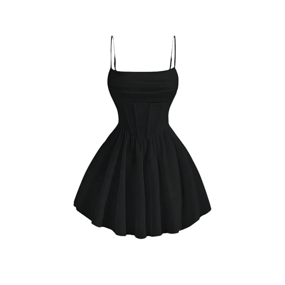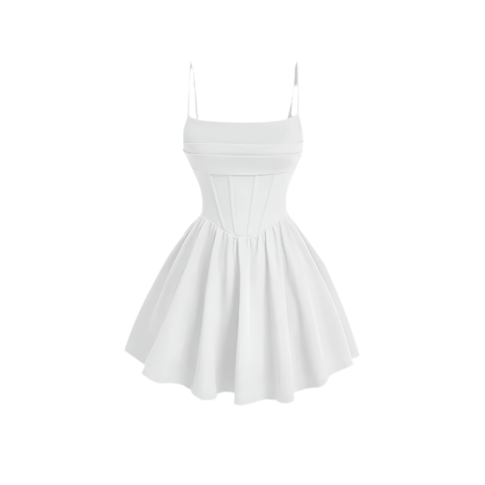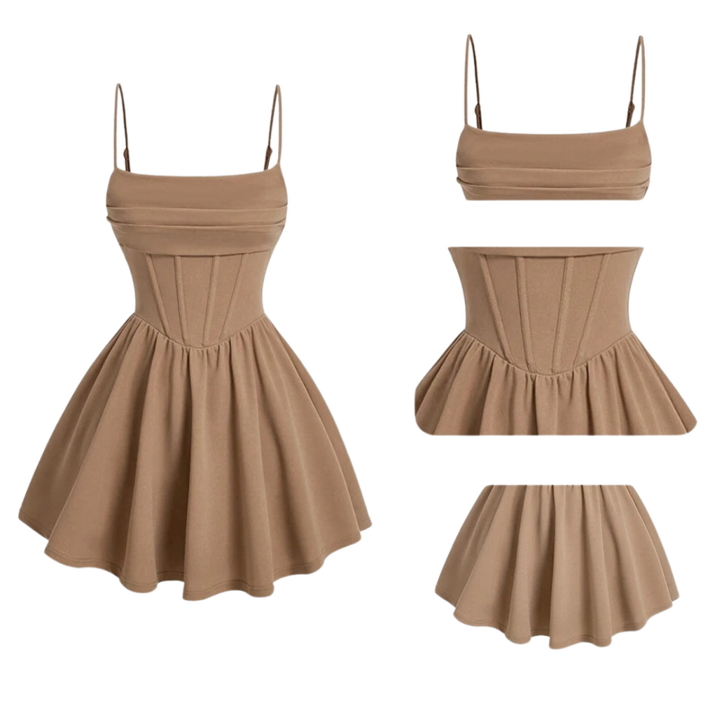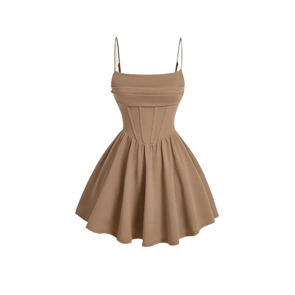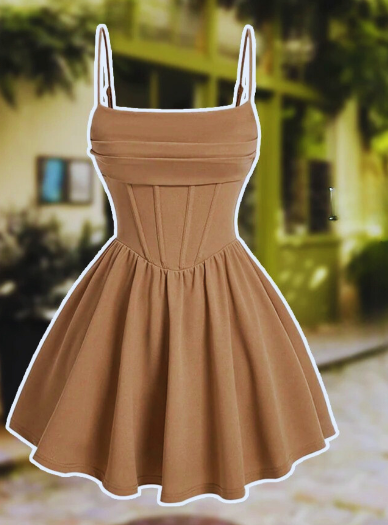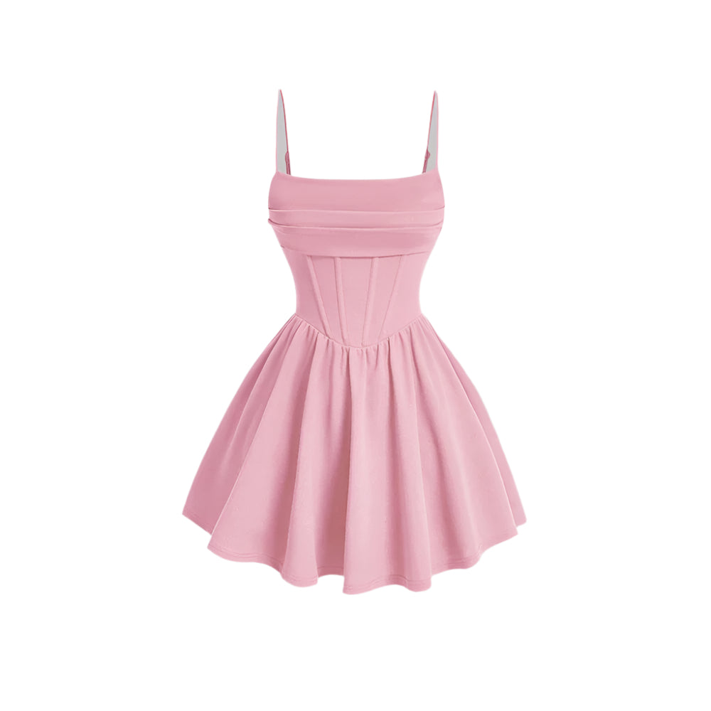 Denne A-linjeformede minikjolen har en firkantet utringning, er ermeløs og har myke plisseringer som gir en tidløs silhuett. Den ensfargede røde fargen gir et dristig, men likevel raffinert uttrykk, mens den tettsittende overdelen og den utsvungne skjørtet skaper en balansert, feminin form.