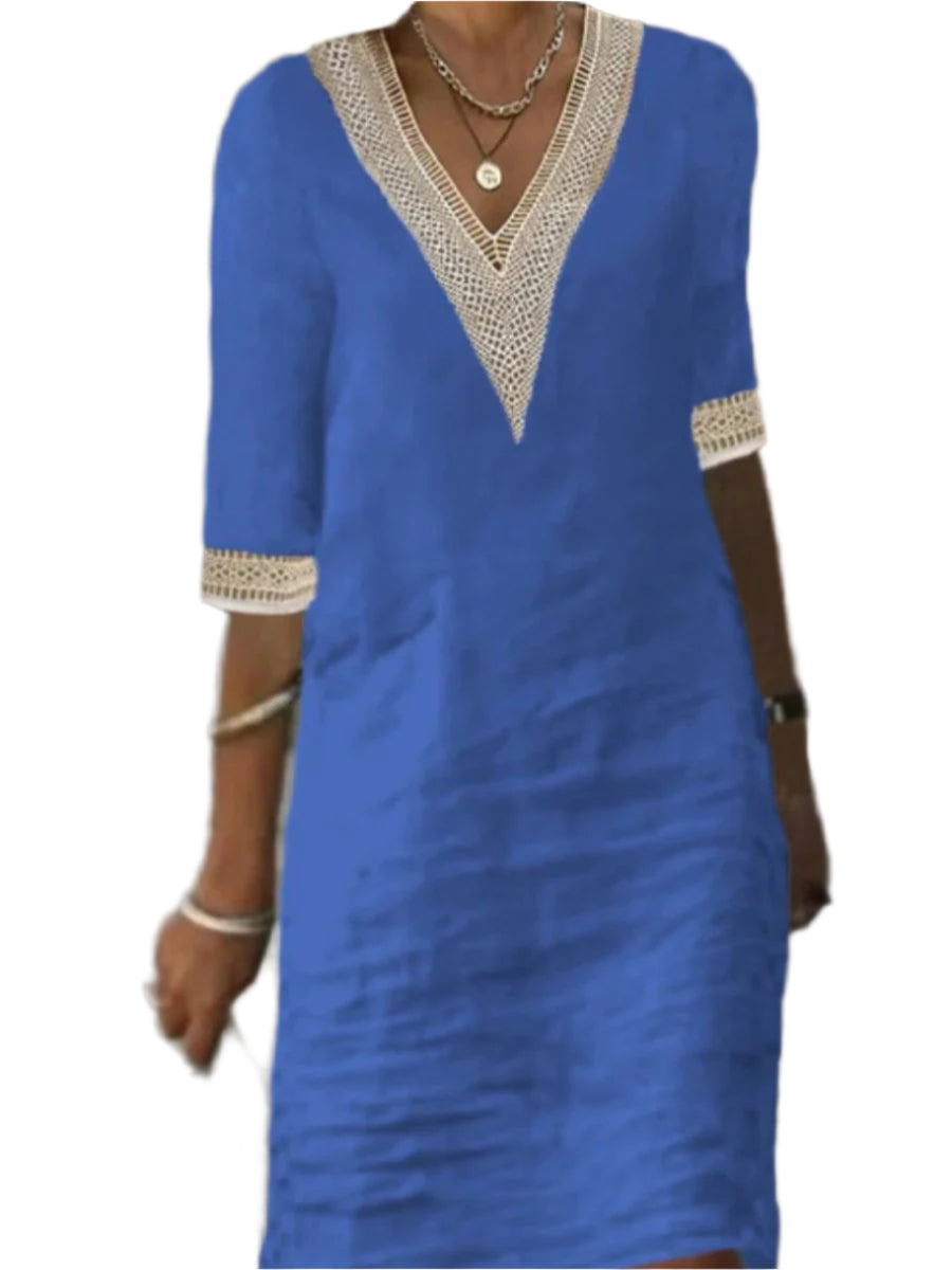 Opplev stil og komfort med denne kjolen, perfekt for varme dager. Den flatterende V-halsen med delikat blondertrim og trekvartlange ermer gir et sofistikert preg, samtidig som den avslappede passformen sikrer komfort hele dagen.