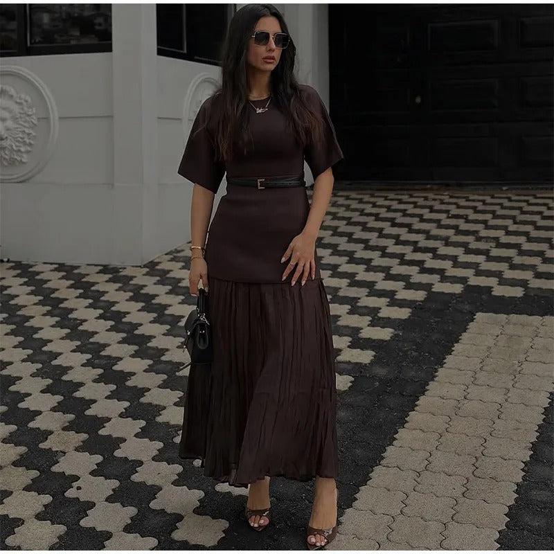 Denne slim fit-kjolen har rund hals, ermer i mesh-lappeteppe og myke plisseringer som gir et elegant og moderne uttrykk. Halvlange ermer gir lett dekning, mens den tettsittende silhuetten gir struktur uten å gå på bekostning av komforten.