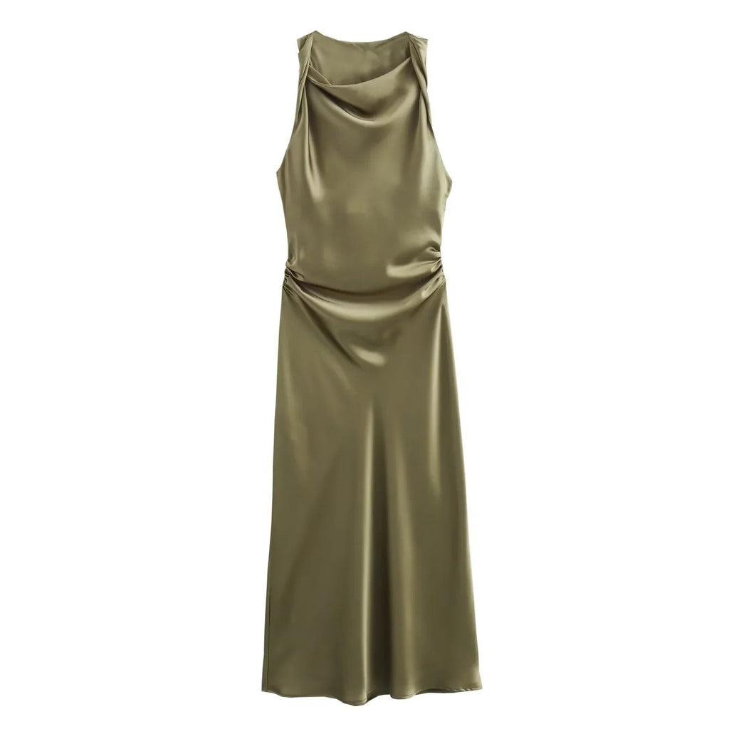 Denne underkjolen i sateng har en glatt overflate, ermeløst snitt og midilengde som gir en tidløs, feminin look. Den lette draperingen skaper myk bevegelse, mens den smale passformen smigrer uten å føles begrensende. Et raffinert plagg som enkelt løfter garderoben din.