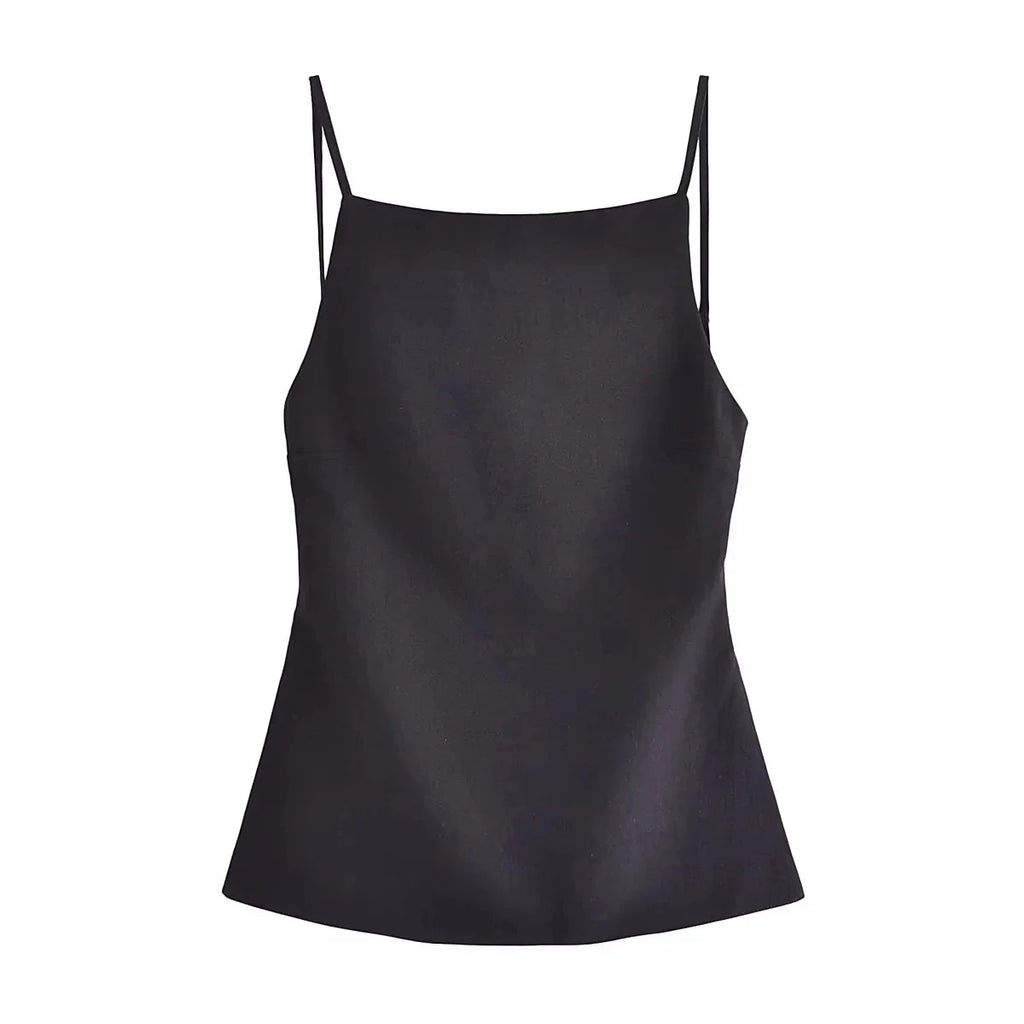 Denne crop-toppen med tynne stropper har en ryggløs silhuett og en slank, kroppsnær passform som gir en dristig, men ren look. Det lette stoffet og det minimalistiske snittet gjør den perfekt til lag på lag eller alene på varme dager. Designet for å balansere komfort og stil.