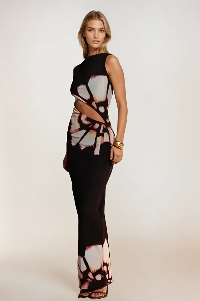 Med sin skulpturerte passform, iøynefallende blomsterprint og dristige, men sofistikerte utskjæringer, gir denne kjolen en elegant silhuett som tiltrekker oppmerksomhet. Den er ideell for både hverdagsbruk og spesielle anledninger, og gir en følelse av luksus og stil.